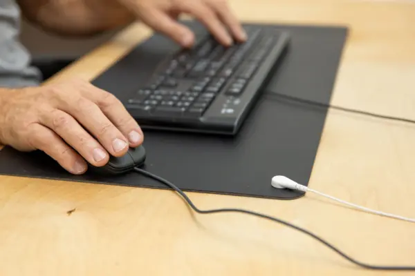 The desk pad reduces electric fields while you work. An earthing cable dissipates the electrical voltage. The desk pad establishes a natural connection to the earth via the skin contact of your forearms.