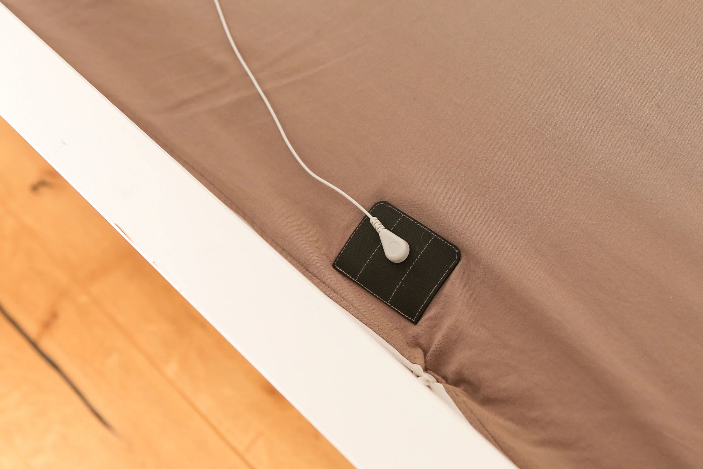 So einfach geht’s: Schliessen Sie das Erdnungskabel am Schlafsack an. Sobald Sie den Stoff berühren, wird die elektrische Spannung auf Ihrem Körper abgeleitet.
