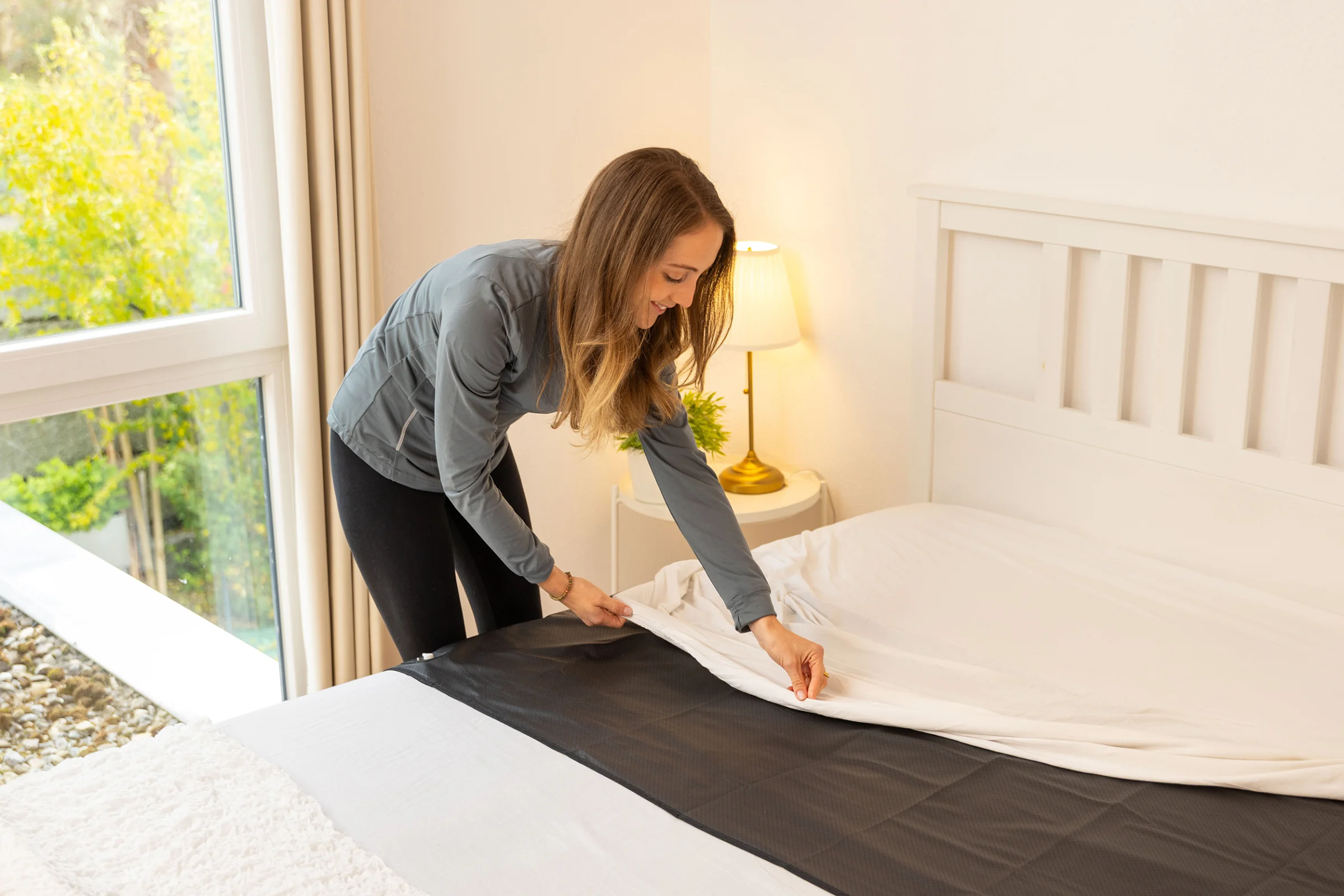 Die Erdungsmatratzenauflage legen Sie direkt auf die Matratze. Platzieren Sie die Auflage unter dem Fixleintuch oder dem eigenen Lieblingsbettlaken. Sie eignet sich perfekt für Doppelbetten sowie für Personen, die ihr gewohntes Leintuch beibehalten möchten. Sie kann wahlweise längs oder quer über das Bett gelegt werden. Je nachdem, ob Sie die Erdung im Bereich von Rücken, Becken oder Füssen bevorzugen.