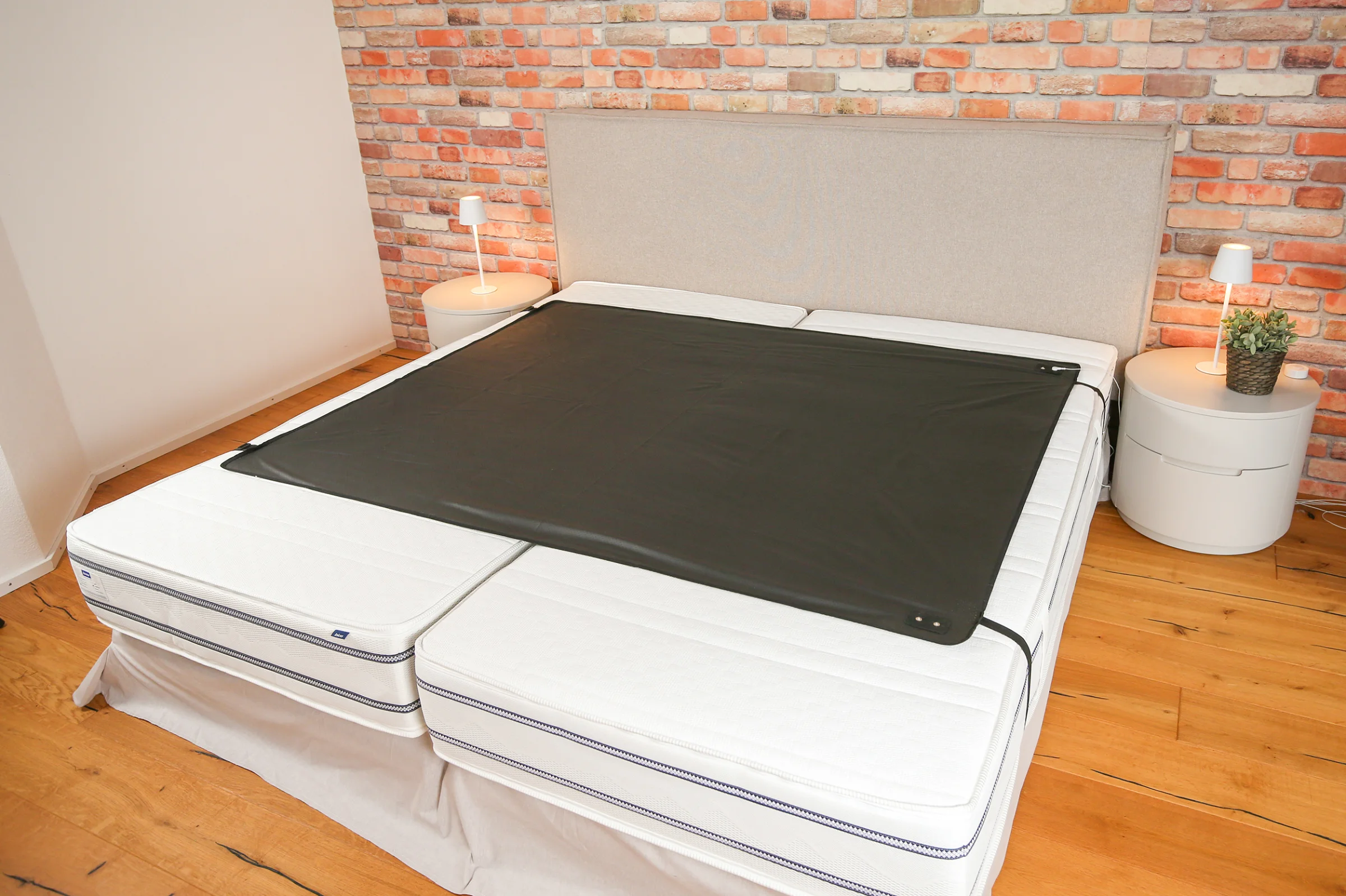 Fixieren Sie die Erdungsmatte bzw. den Molton sicher und fest. Dies ist wichtig, damit Ihr Körper grossflächig mit der Matte in Kontakt ist. Die Matte gibt es meist in den Grössen 68cm x 180cm und für das Doppelbett in 138cm x 180cm. Elastische Spannbänder sind dazu da, den Erdungsbezug an den Ecken auf der Matratze zu fixieren. Dazu ziehen Sie die Bänder unter der Matratze hindurch. Diese Bänder umschliessen die Matratzenecken und verhindern ein Verrutschen. Das darübergezogene Fixleintuch erzeugt zusätzlichen Druck, welcher die Position fixiert. So bleibt die leitfähige Fläche während der gesamten Nachtruhe exakt unter dem gewünschten Körperbereich.