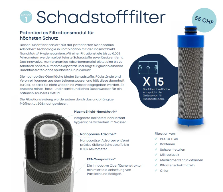 Die leistungsstarke Filtereinheit arbeitet bis in den Nanobereich und entfernt selbst feinste Partikel zuverlässig aus dem Leitungswasser. Gleichzeitig bleibt der Wasserdruck konstant, sodass keine Einbusse beim Duschen entsteht.