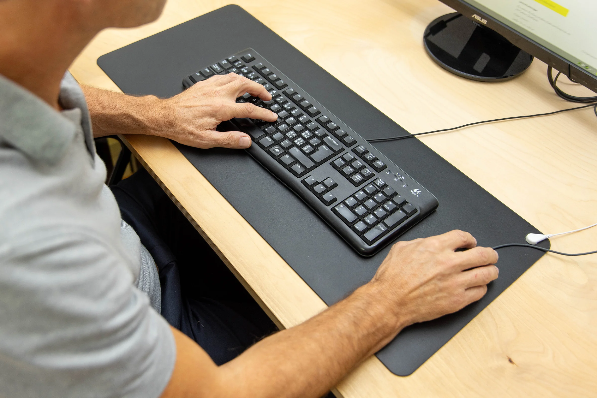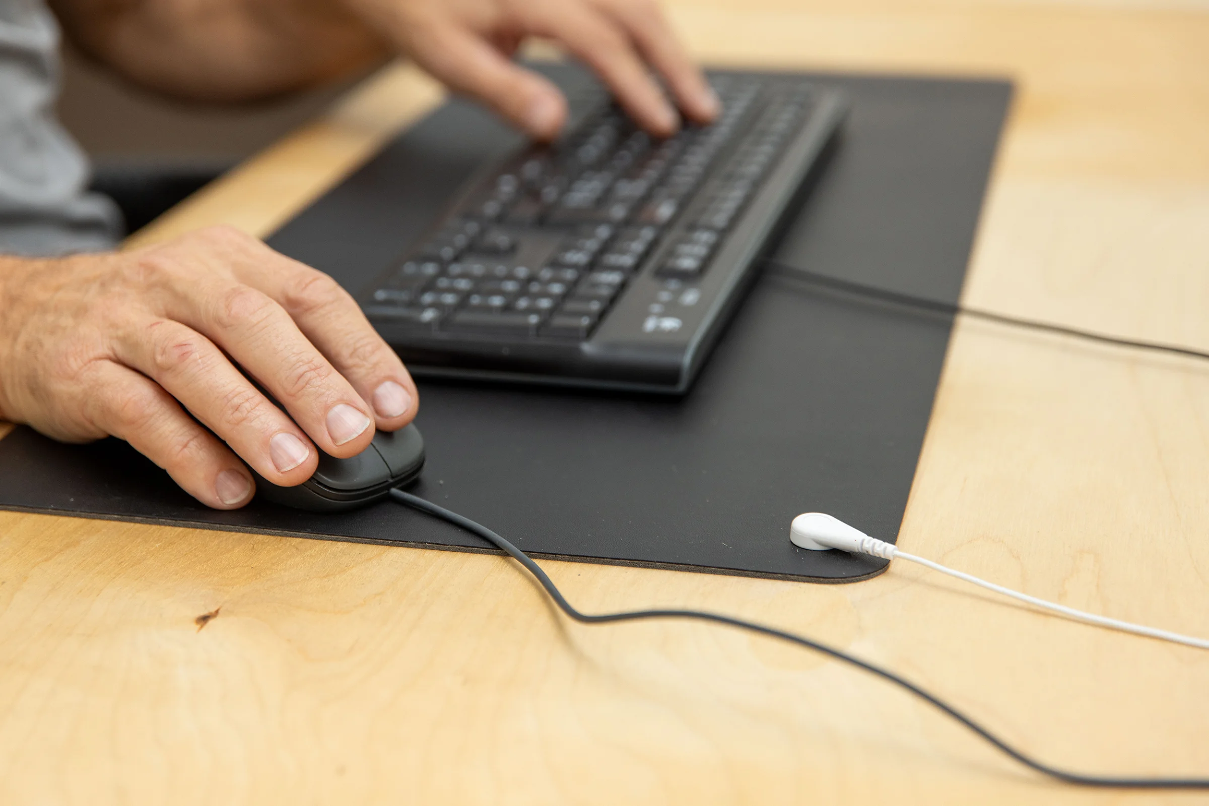 Während Sie arbeiten, reduziert die Schreibtischunterlage elektrische Felder. Ein Erdungskabel leitet die elektrische Spannung ab. Die Schreibunterlage stellt über den Hautkontakt Ihrer Unterarme eine natürliche Verbindung zur Erde her.